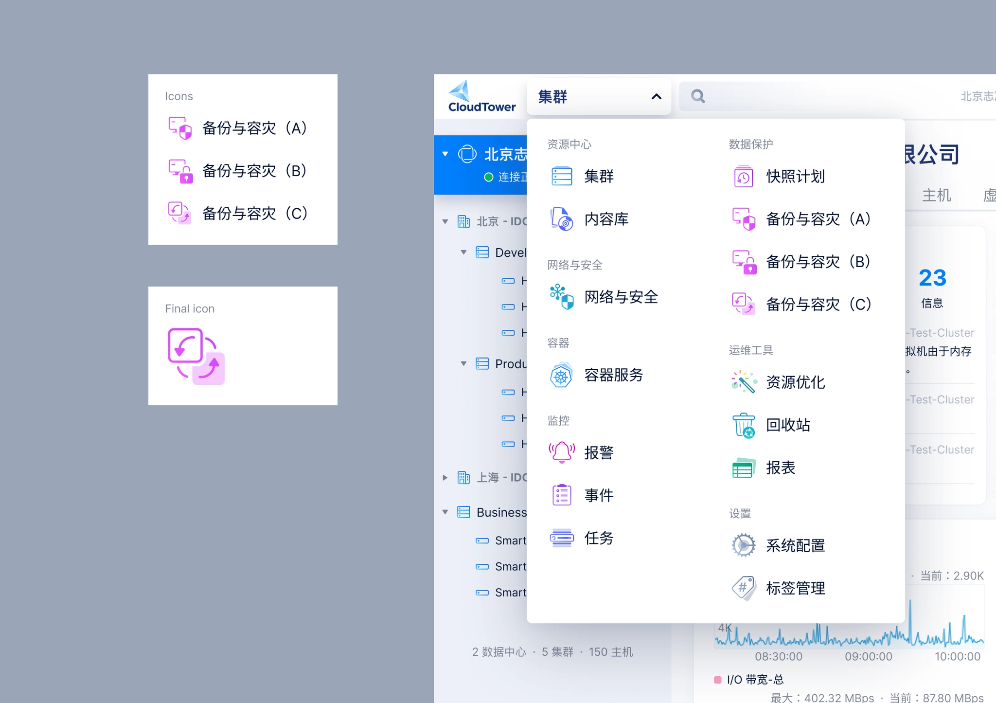After completing the overall UI spec for the feature, I started designing a logo for Backup & Disaster Recovery, which would be displayed in the feature list and on the product introduction page of the website.