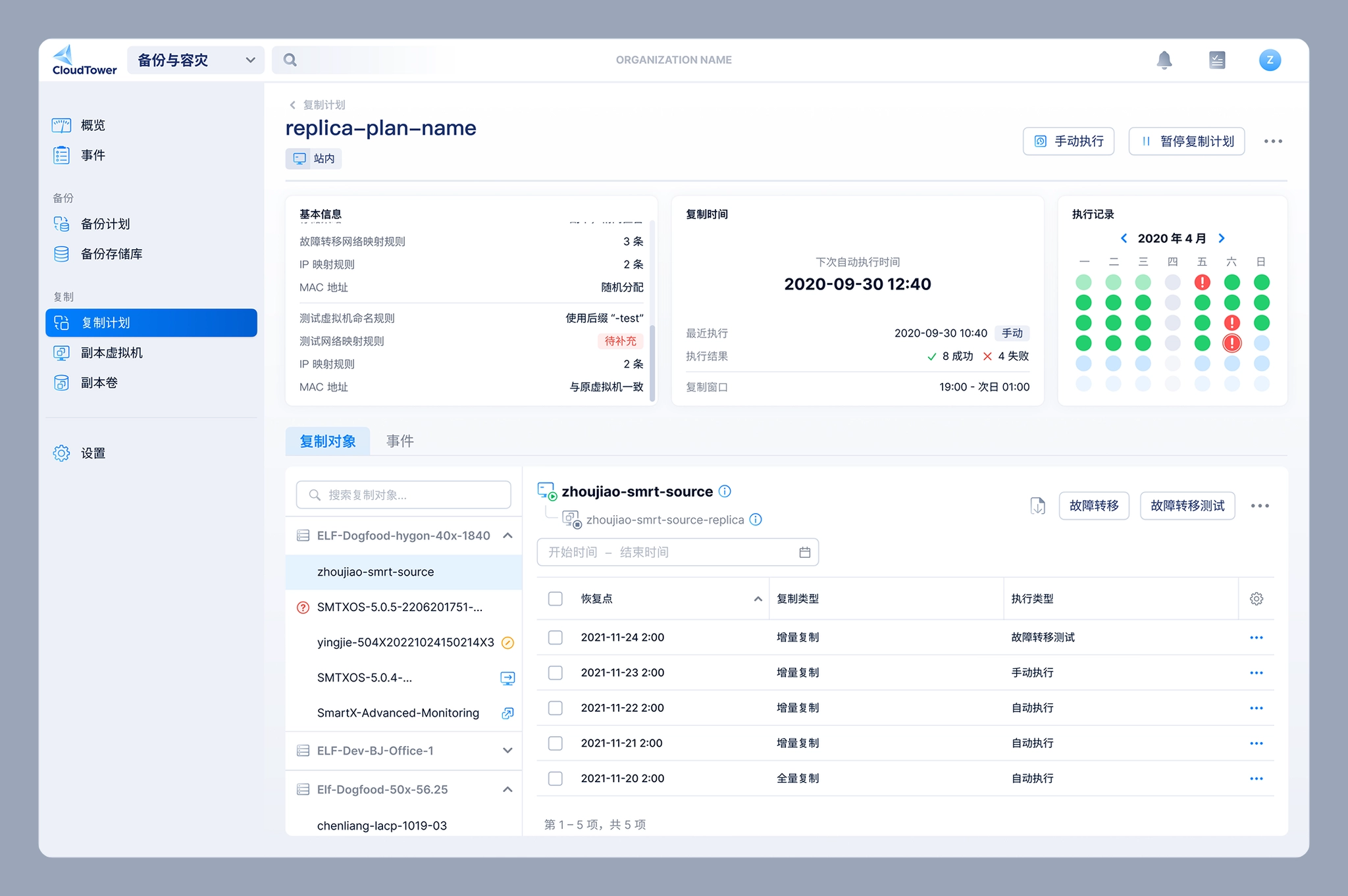 SmartX Backup & Disaster Recovery is a function set that includes Backup and Replication (including asynchronous replication and synchronous replication).