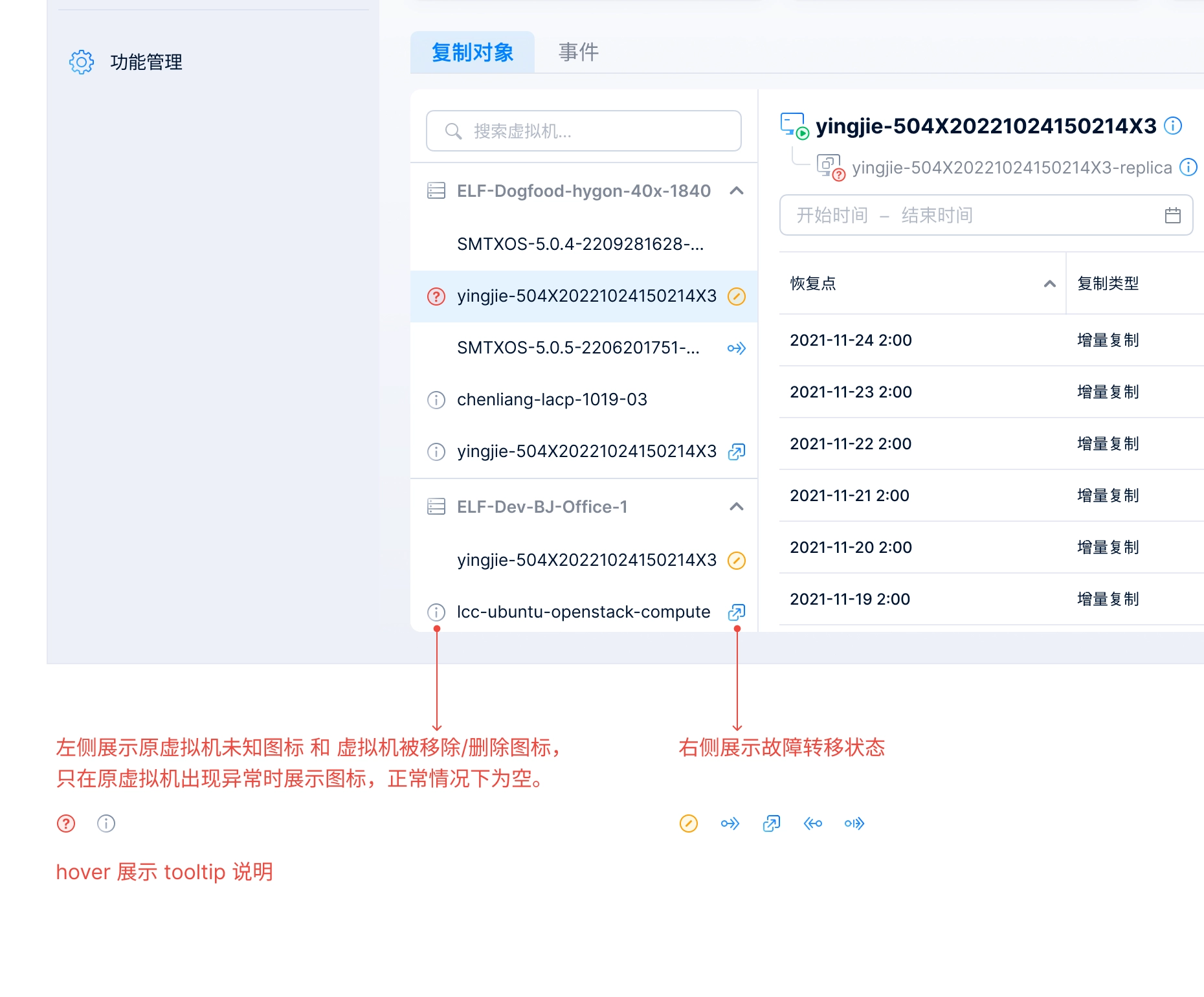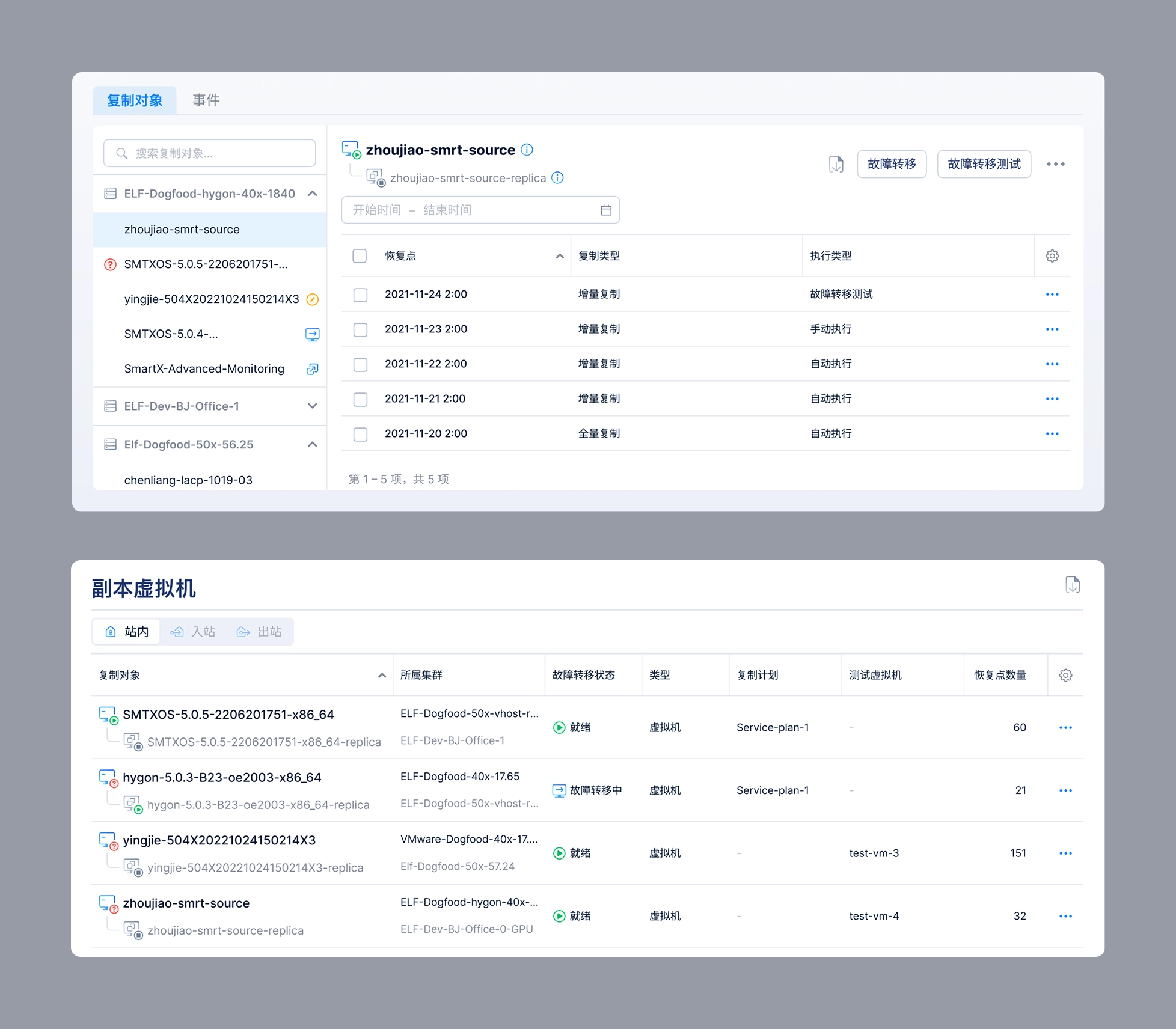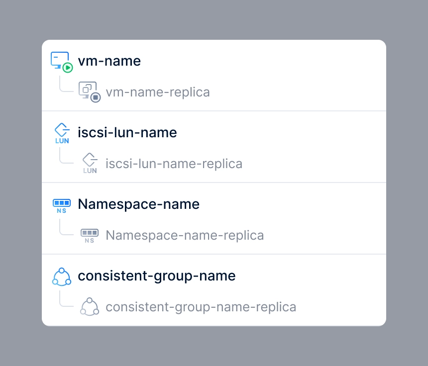After a virtual machine is added to a replication plan, a replica VM is created in the target cluster. On the Replication Plan Details page and the Replicated Objects page, I needed to consider how to clearly represent both the source VM and the replica VM.