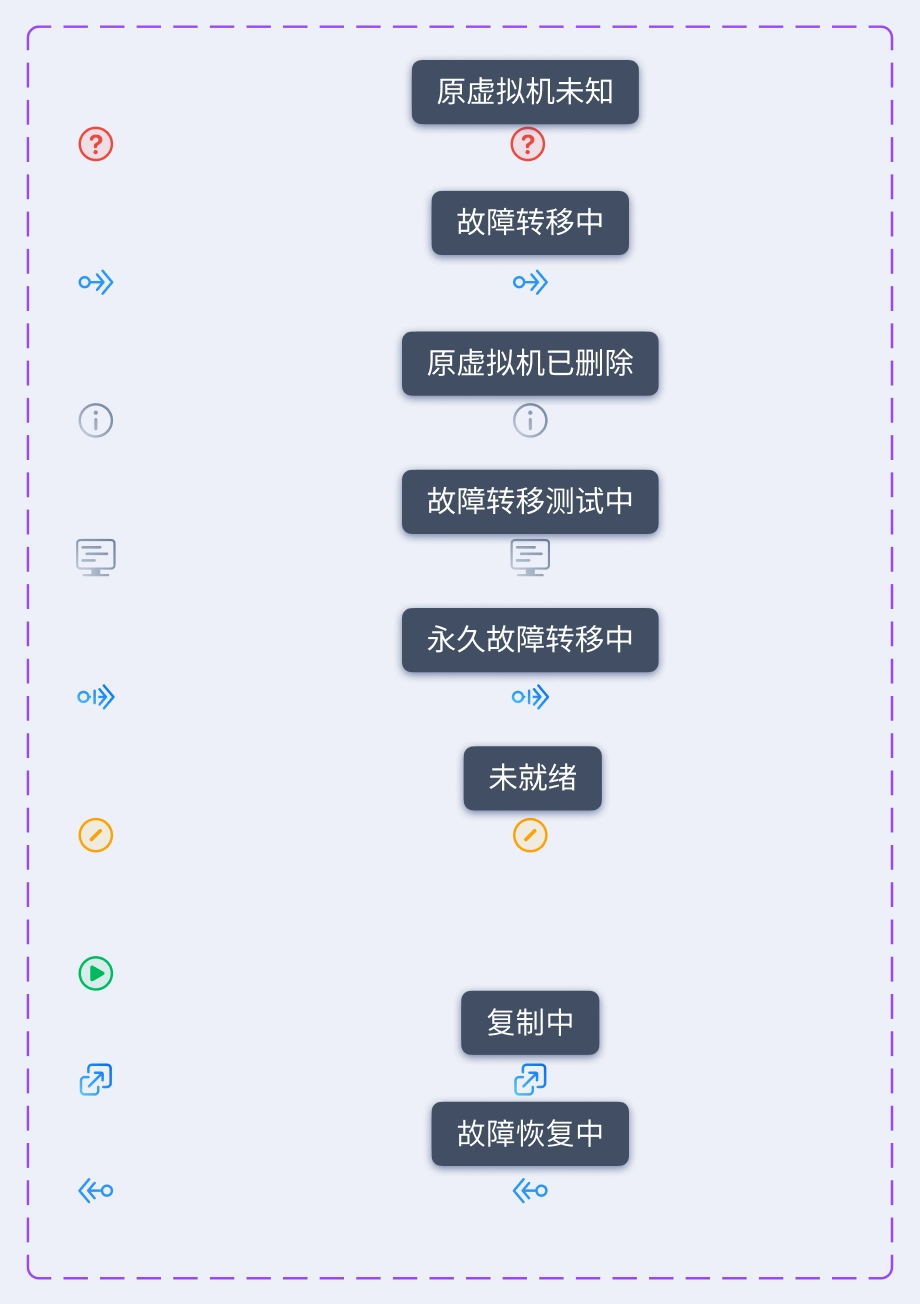 To address this, I designed a connected-line UI to visually convey the relationship between the VMs. I also introduced status indicators for the VMs: under normal conditions, the source VM remains powered on; when the source VM fails, the replica VM takes over, at which point the source VM is powered off and the replica VM becomes powered on. These status indicators are displayed in the bottom-right corner of the source VM and replica VM icons.