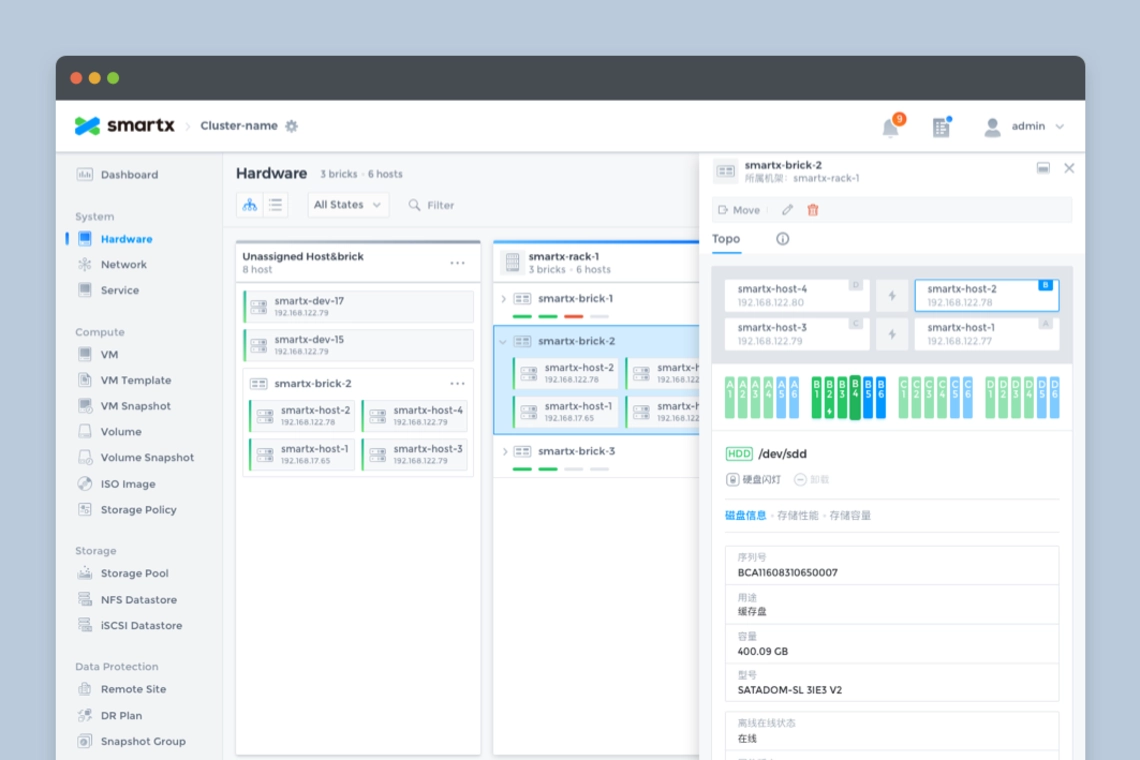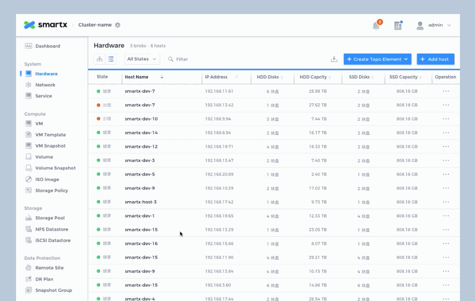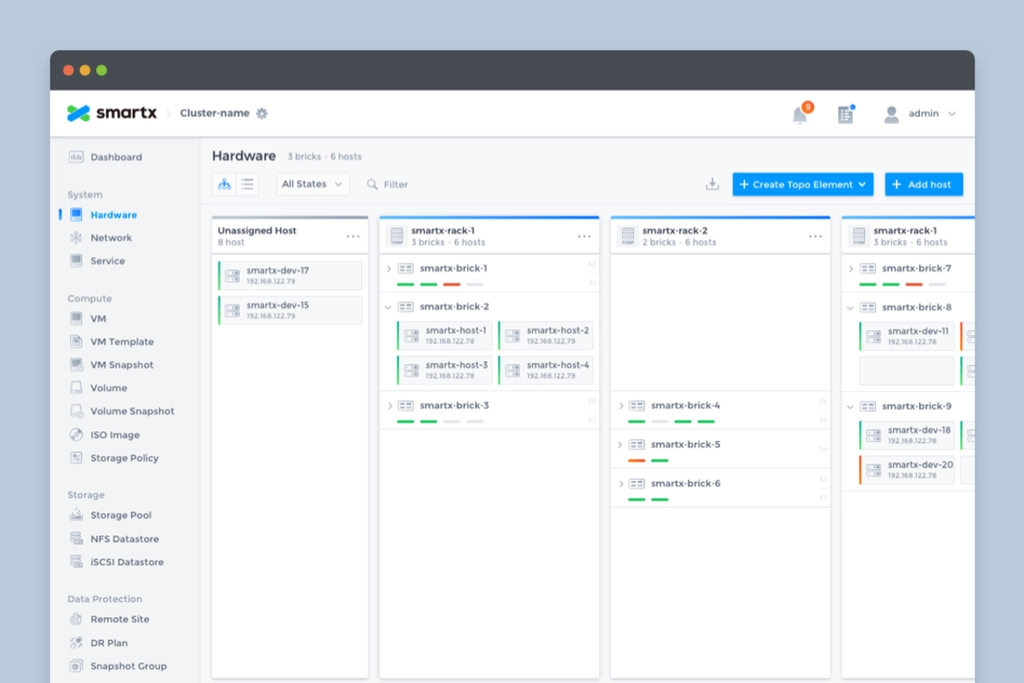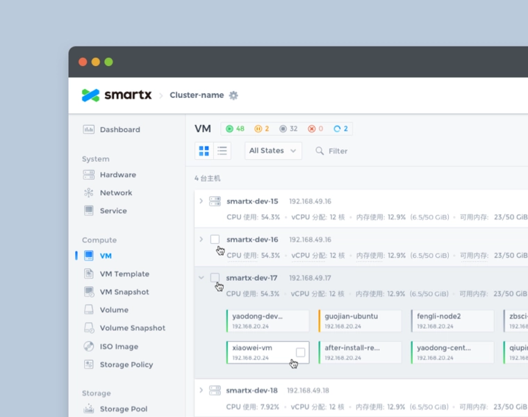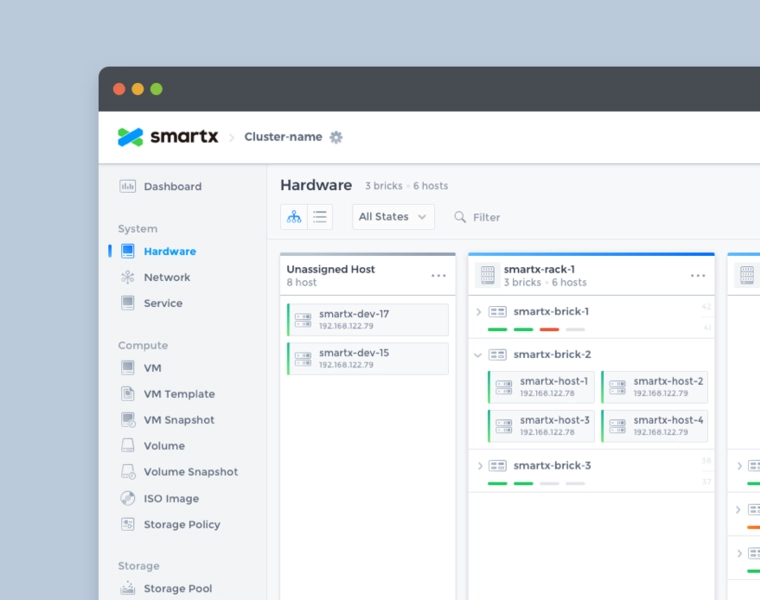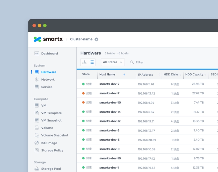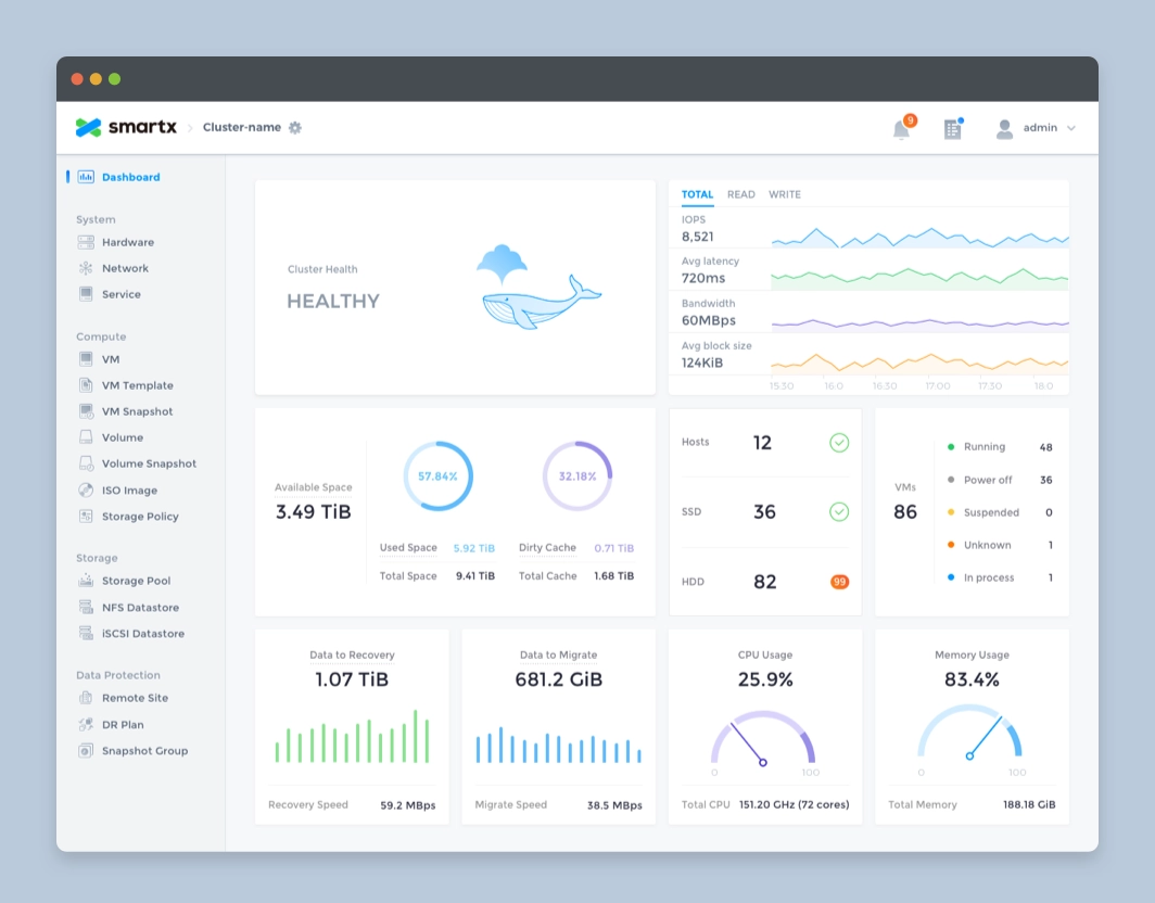 SmartX OS is an operating system designed for hyper-converged architectures, helping customers build agile and efficient modern data centers. Fisheye is the web-based console for SmartX OS, providing the most intuitive platform for system administrators to monitor system status and data metrics.