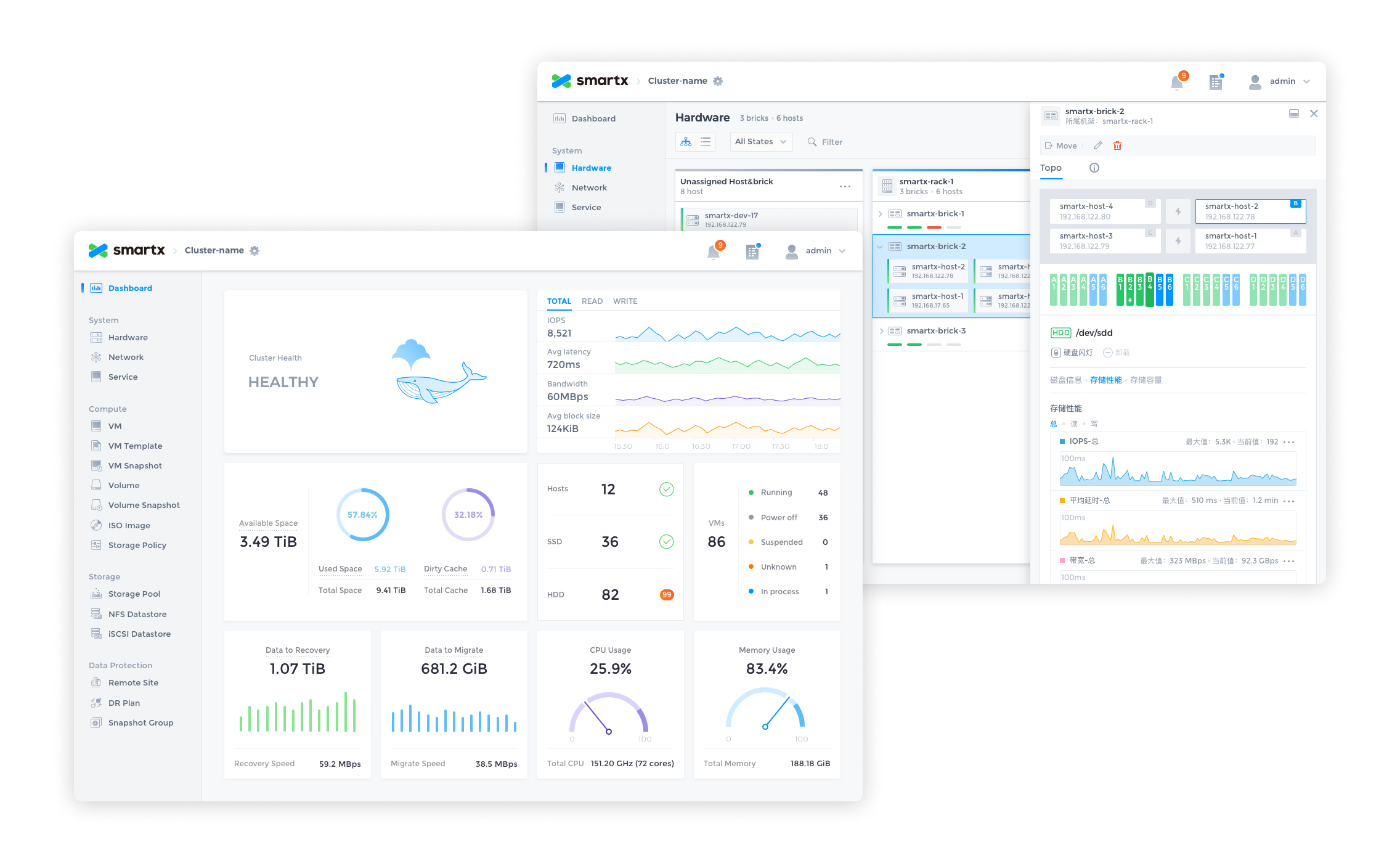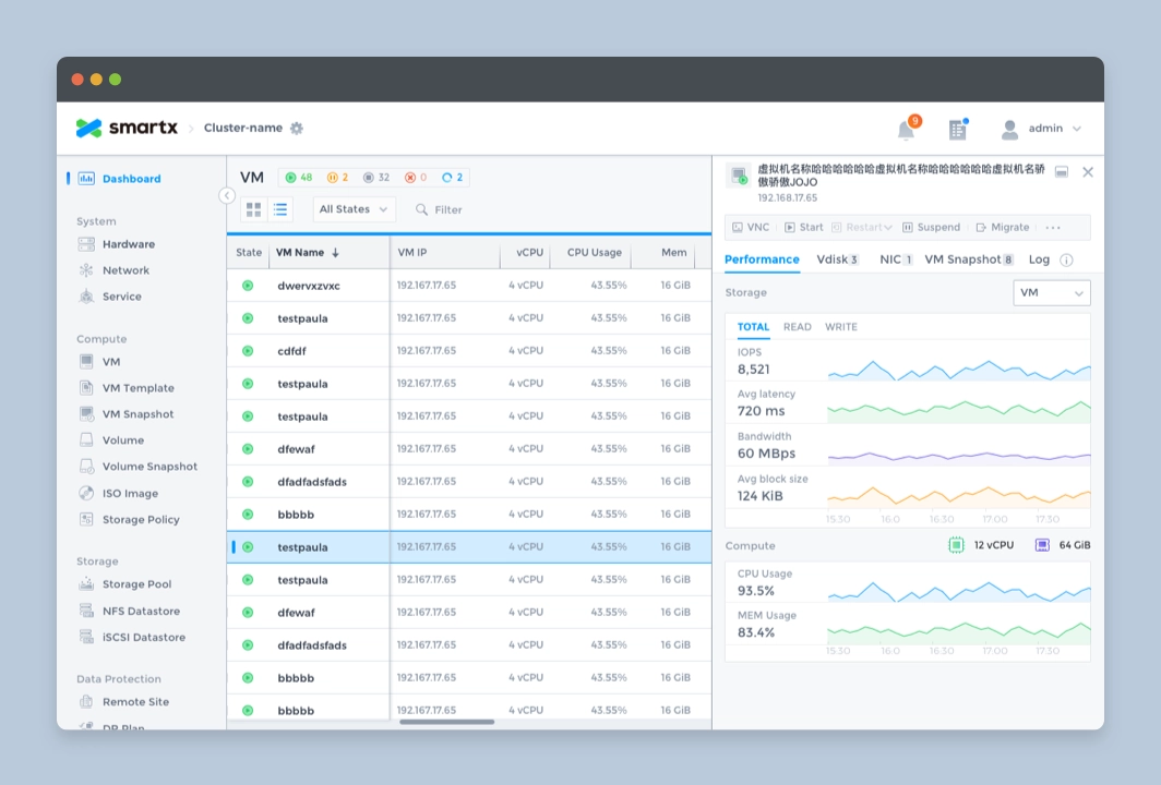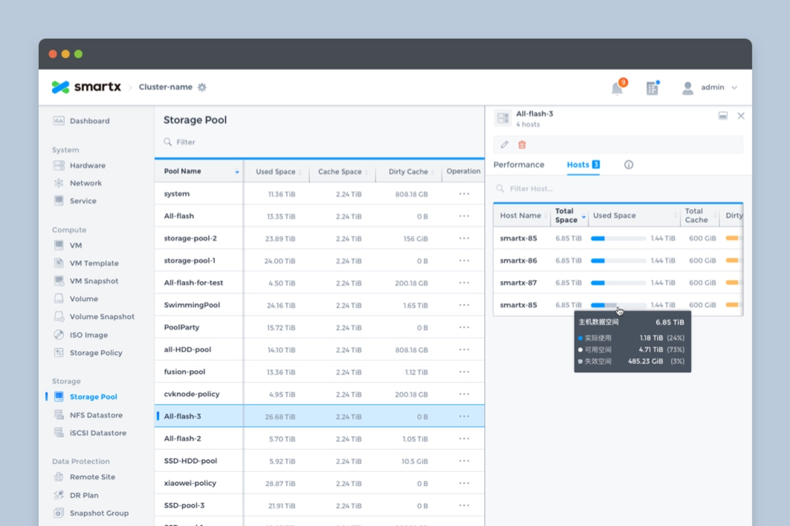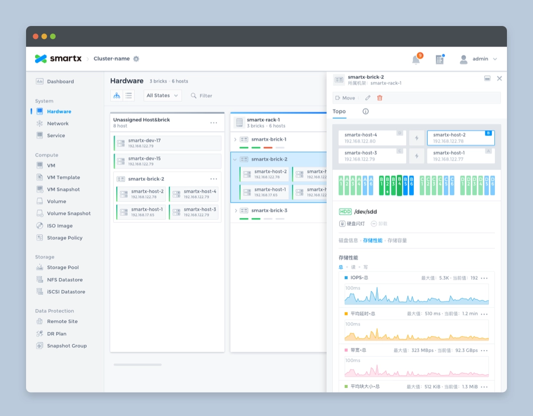 SmartX OS is an operating system designed for hyper-converged architectures, helping customers build agile and efficient modern data centers. Fisheye is the web-based console for SmartX OS, providing the most intuitive platform for system administrators to monitor system status and data metrics.