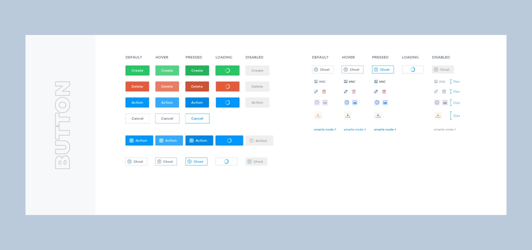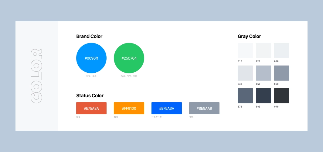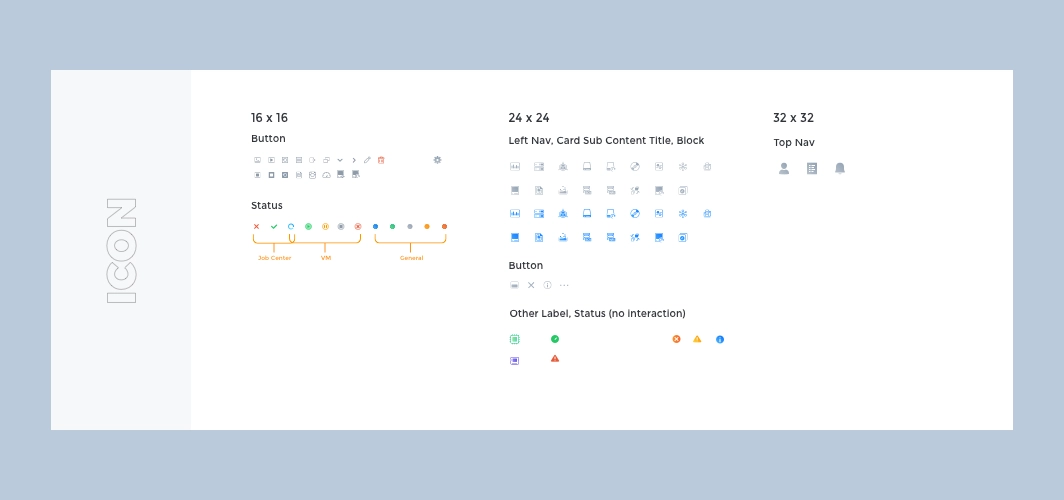 The most basic visual elements, including colors, fonts, page layout, shadows, and transition animation effects are set throughout the redesign. In order to be able to establish the brand identity in the product, the brand color is integrated into the design of the system. The color is pure and can be used as a highlighting color for selected effects, text links, etc. In use, the system will monitor the status of many hardware and services, including servers, hard disks, virtual machines, etc., and respond to the status in real time in the Fisheye interface, so in addition to the brand color, also pre-set the color to reflect different states, the most common states include: running, suspended, error, and shutdown.