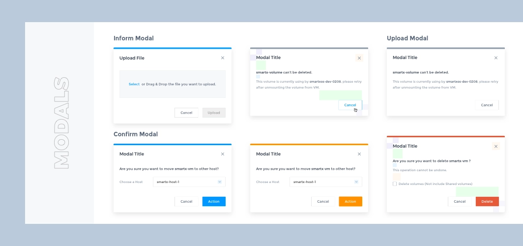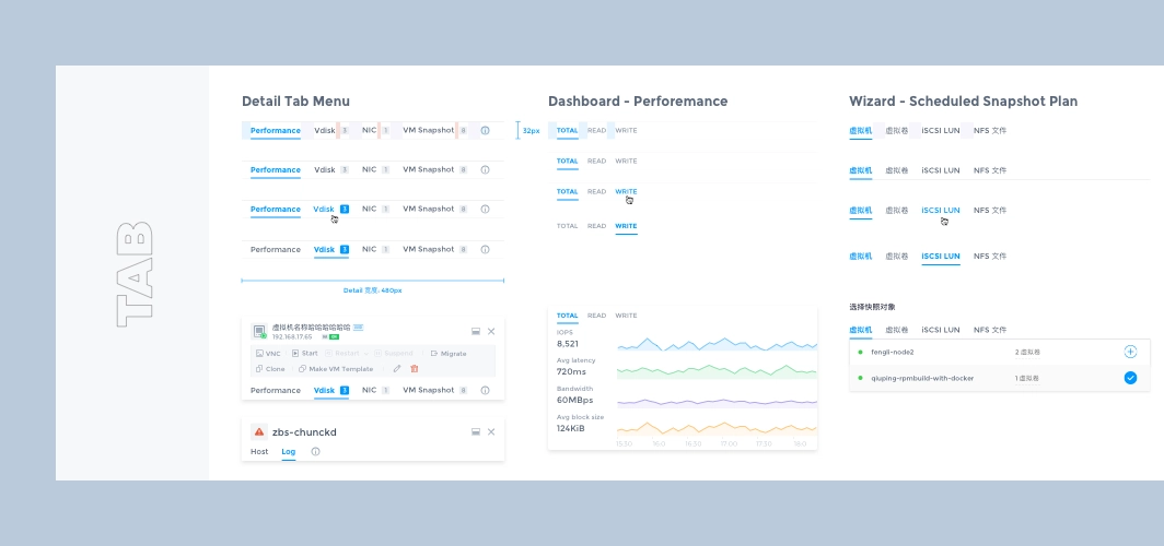 It has completed 2 major feature iterations in the past 2 years, adding several important features such as virtual machine management, snapshots, storage pools, etc., and is about to receive the 3.0 version update. In the previous version, the design was more focused on completing the features planned in each version, and the design was focused on how to design the feature well, lacking systematic design thinking. For example, the same component is designed multiple times in different versions, but the style and interaction are not exactly the same.
