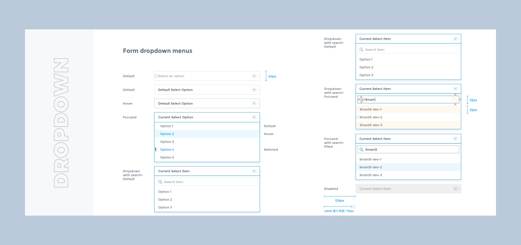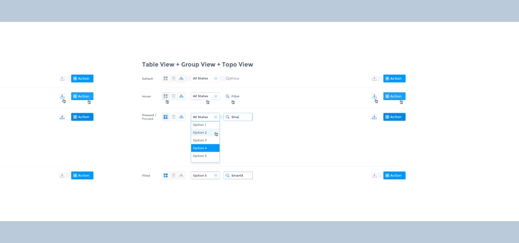 After completing the basic control styles, we started exploring the information architecture and experimenting with flexible and scalable interaction forms for Fisheye. The following are some of the ones used in the product.