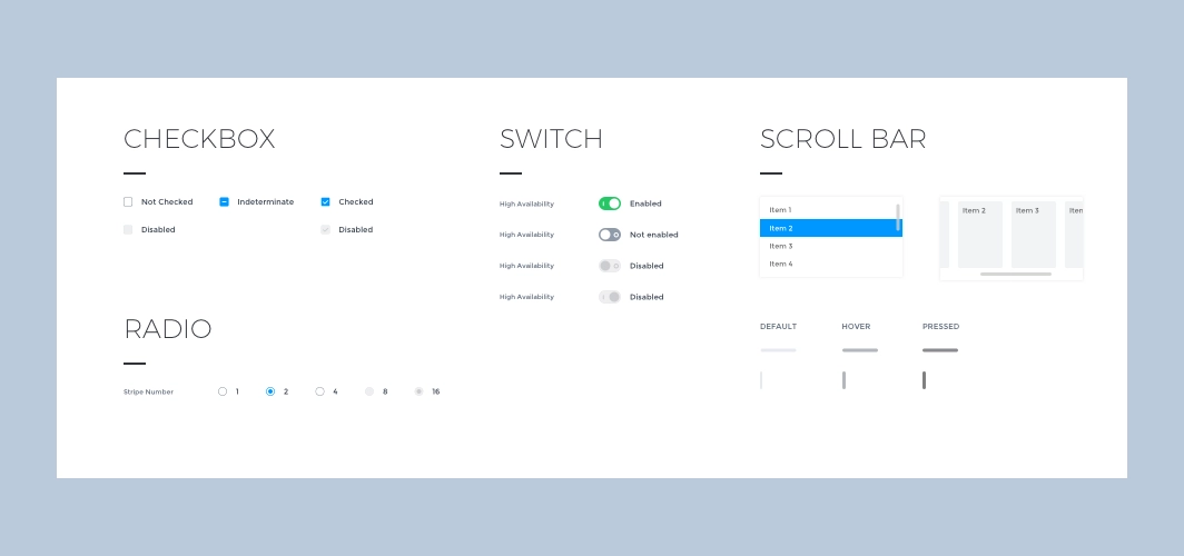 Atoms: checkbox, radio, switch, scroll bar.
