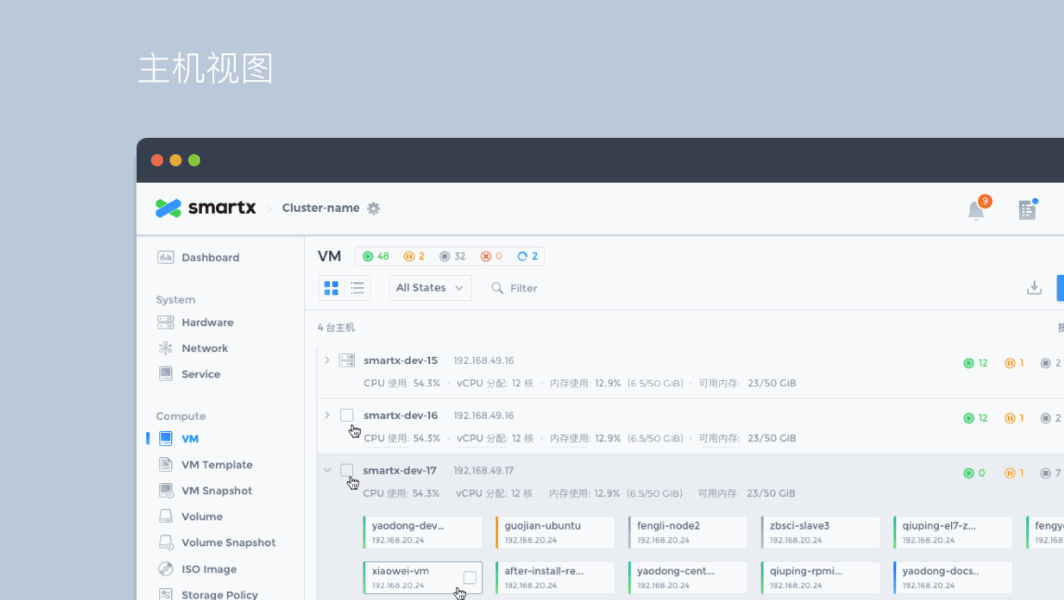 List is the most common element in the system, very suitable for displaying a large amount of data, convenient for administrators to compare, filter and batch operations, but for some functions with dependencies, the list does not visually reflect the relationship between the data, such as how the hosts are organized in the rack, how many virtual machines are running under one host? For this reason we design a more intuitive view for the administrator based on the list view for some functions.