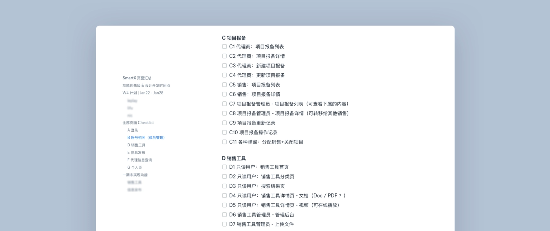 Page lists: We broke down the whole product into 8 modules. Then I made a list of all pages I need to design based on PRD and user flows.