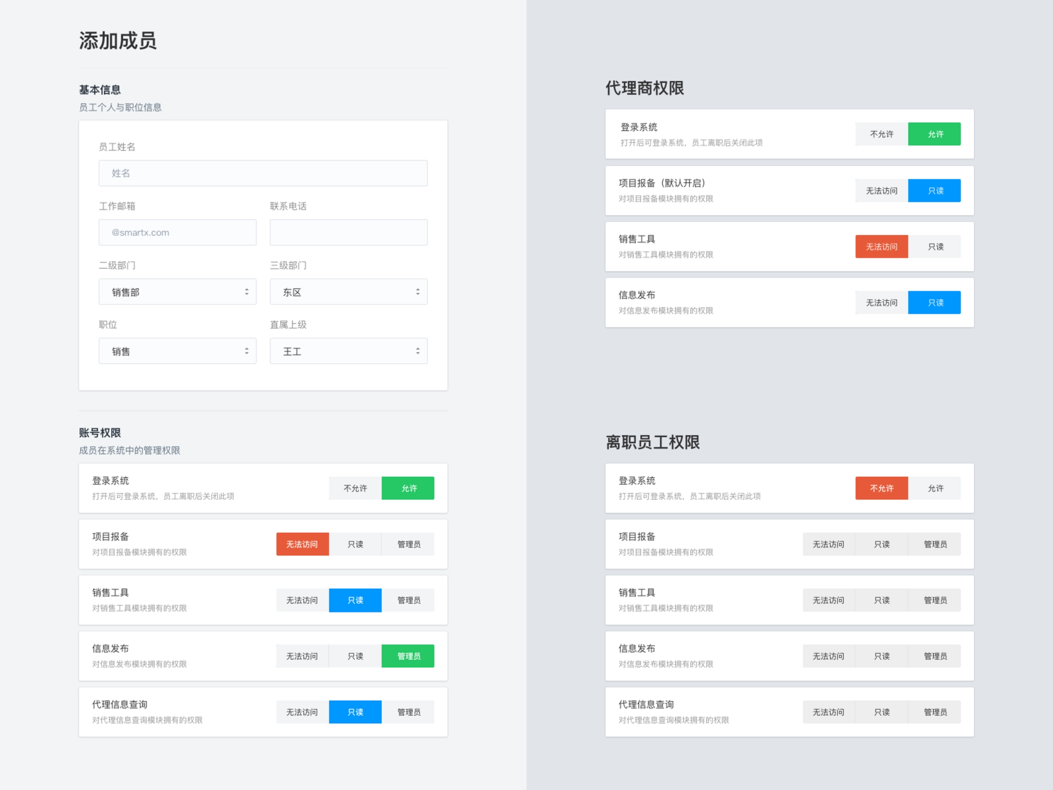 We broke down each role's permission into smallest pieces, then we set three permissions for each feature module: Invisible, Read only and Edit. The administrator could decide member's permission when he created accounts.